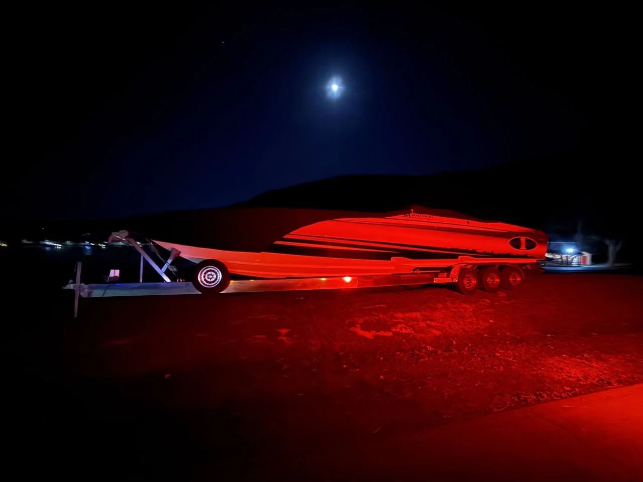 Includes a fully polished and completely refurbished aluminum triple axle trailer with polished aluminum wheels and electric over hydraulic brakes.